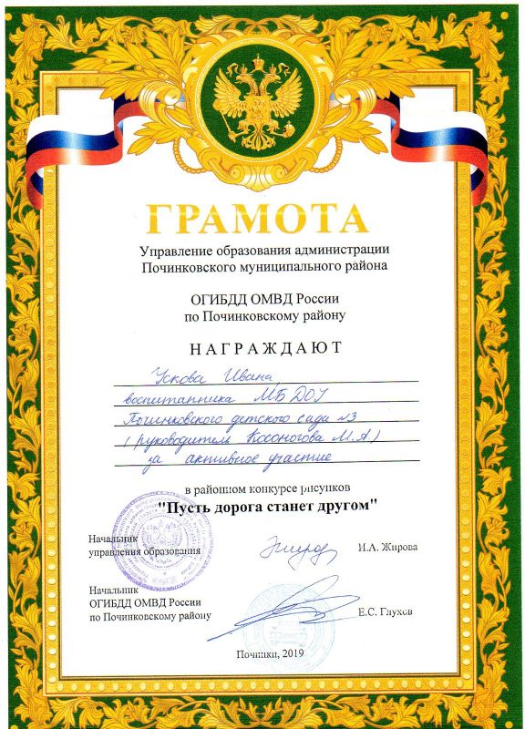 - Благодарственное письмо Управления образования Администрации Починковского района, сентябрь 2019 г.